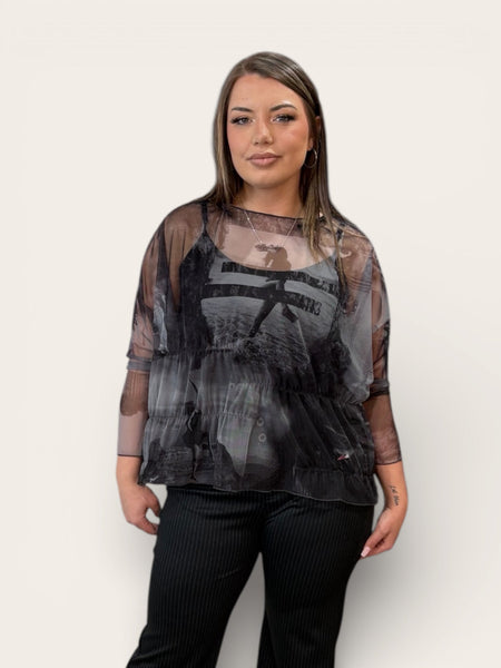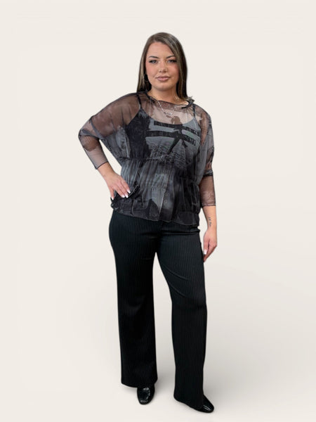 Effortless fluidity with a touch of edge. The Barely Wabi Sabi Top brings shape and dimension to sheer layering with internal elastic detailing that creates the effect of soft gathers and drape. Its long sheer sleeves and crew neckline strike a balance between structure and softness, while the flowy fit skims away from the body. Best styled over our Flared Shell, this piece offers an artful layered look with modern ease.