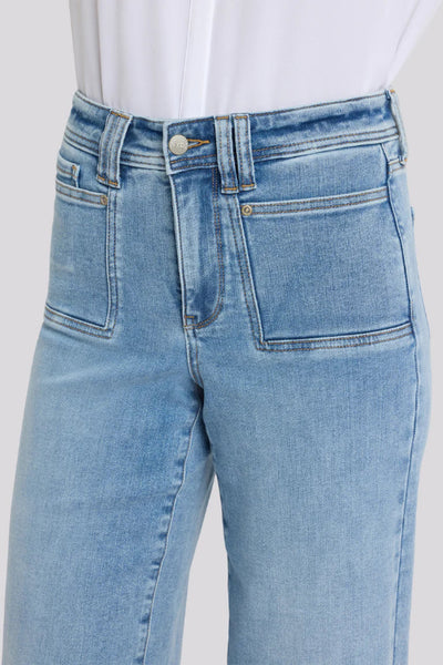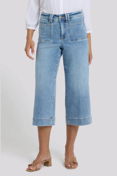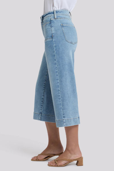 A major wide leg gives NYDJ's Brigitte Wide Leg Capri Jeans a dramatic look, while body-hugging design through the waist and hips enhances your natural silhouette. NYDJ Lift Tuck® Technology uses a proprietary slimming panel with a patented criss-cross design to shape and support your curves, providing a smoother fit in front and boosting in back. Features five-pocket styling with squared front patch pockets and classic back patch pockets, a zip fly with button closure and deep trouser hems.