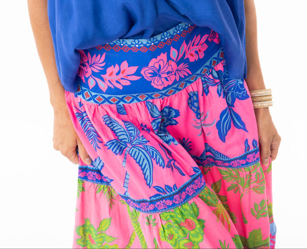 Whisk yourself away with the dream-laced Lidia Skirt. Crafted from 100% cotton, its tiered silhouette flows with ease, with a soft ruffle hem. A standout piece that blends romance and effortless wearability with its sweet wild botanical design.