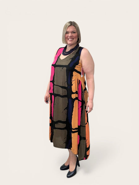 Meet your new standout piece. This multicoloured V-neck, sleeveless dress is crafted from 100% rayon, giving it an ultra light breathable feel you'll reach for time and time again. This maxi dress is designed in a long, straight silhouette and then has unique high side gathering details that create an interesting and fun look!