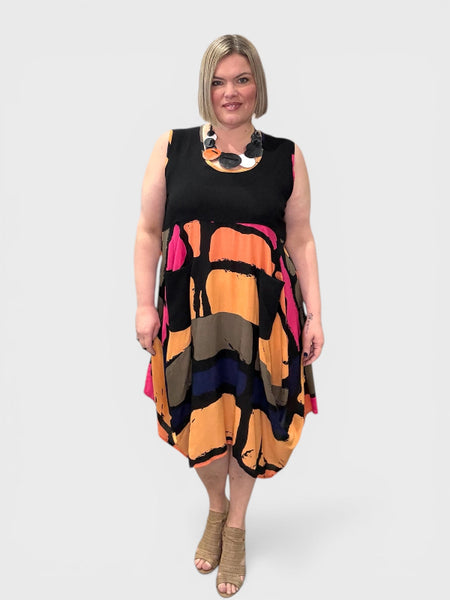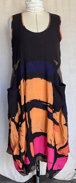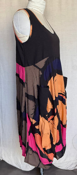 Meet your new standout piece. This multicoloured round neck, sleeveless dress is crafted from 100% rayon, giving it an ultra light breathable feel you'll reach for time and time again. Designed in a relaxed cocoon silhouette, it billows beautifully before tapering in for that effortlessly flattering shape. And yes- pockets included.